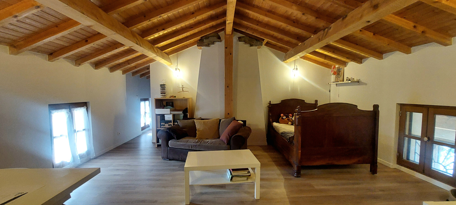 À l’étage, trois grandes chambres (jusqu’à 25 m²) avec poutres apparentes et certains murs en galets et pierres, un grand espace de travail en mezzanine, une salle d’eau et un 3ème toilette indépendant composent un espace nuit confortable pour toute la famille.