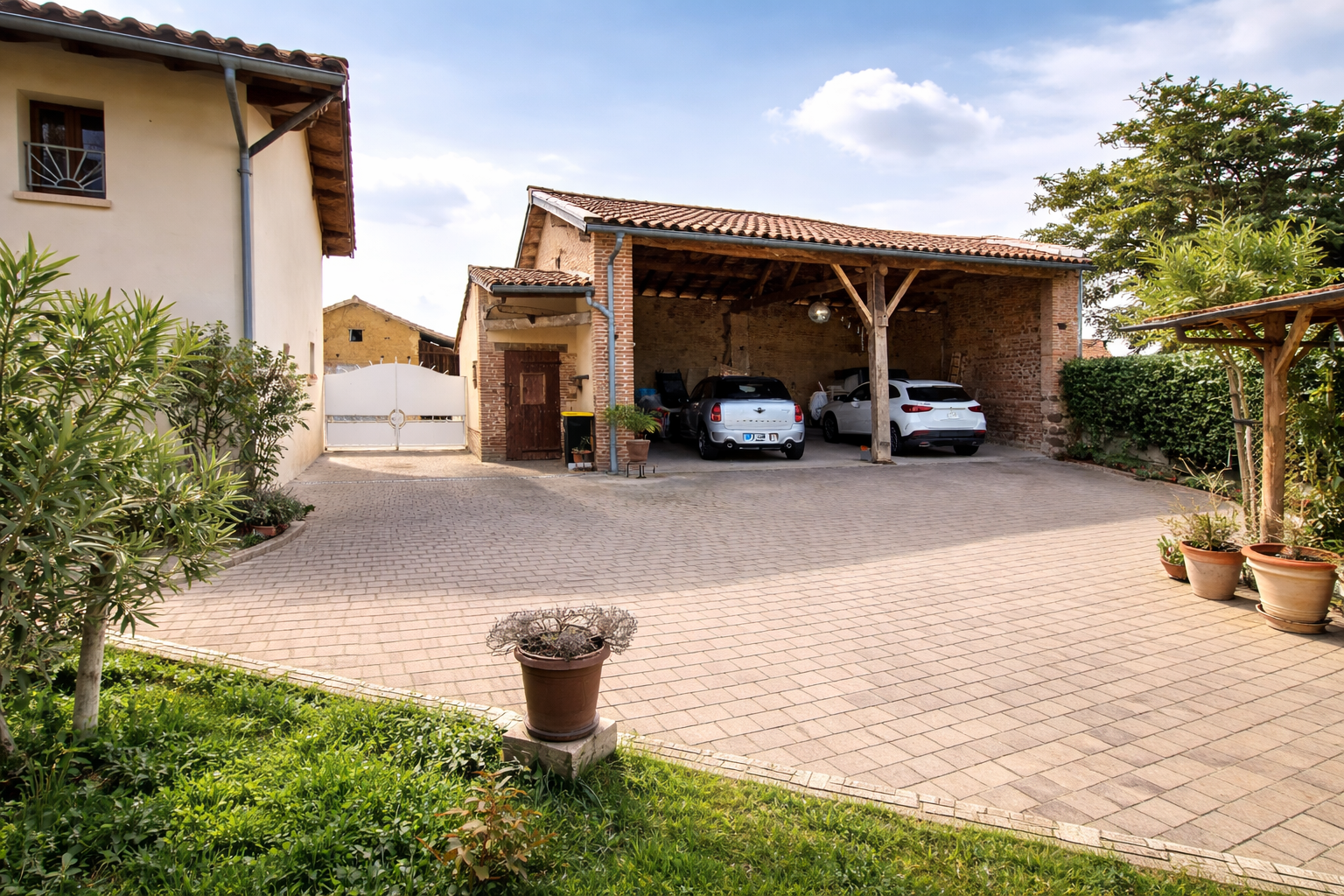 Une superbe grange avec ses murs en briques et galets permet d'abriter jusqu'à 4 voitures en plus de l'aire de stationnement, ainsi qu'une remise pour l'outillage.